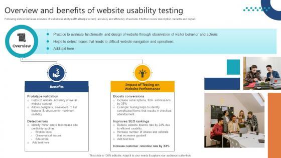 Following slide showcases overview of website usability test that helps to verify accuracy and efficiency of website. It further covers description, benefits and impact. Boost your pitch with our creative A30 Complete Guide To Launch New Website Overview And Benefits Of Website. Deliver an awe-inspiring pitch that will mesmerize everyone. Using these presentation templates you will surely catch everyones attention. You can browse the ppts collection on our website. We have researchers who are experts at creating the right content for the templates. So you do not have to invest time in any additional work. Just grab the template now and use them. Following slide showcases overview of website usability test that helps to verify accuracy and efficiency of website. It further covers description, benefits and impact.
