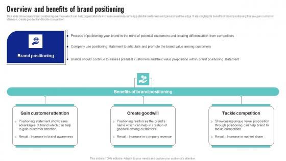 This slide showcases brand positioning overview which can help organization to increase awareness among potential customers and gain competitive edge. It also highlights benefits of brand positioning that are gain customer attention, create goodwill and tackle competition Here you can discover an assortment of the finest PowerPoint and Google Slides templates. With these templates, you can create presentations for a variety of purposes while simultaneously providing your audience with an eye-catching visual experience. Download Overview And Benefits Of Brand Positioning Launching New Product Brand Information Pdf to deliver an impeccable presentation. These templates will make your job of preparing presentations much quicker, yet still, maintain a high level of quality. Slidegeeks has experienced researchers who prepare these templates and write high-quality content for you. Later on, you can personalize the content by editing the Overview And Benefits Of Brand Positioning Launching New Product Brand Information Pdf This slide showcases brand positioning overview which can help organization to increase awareness among potential customers and gain competitive edge. It also highlights benefits of brand positioning that are gain customer attention, create goodwill and tackle competition