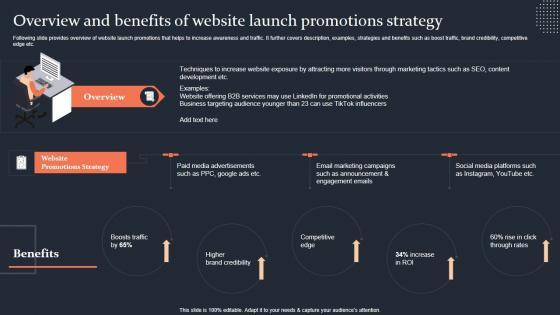 Following slide provides overview of website launch promotions that helps to increase awareness and traffic. It further covers description, examples, strategies and benefits such as boost traffic, brand credibility, competitive edge etc. Presenting this PowerPoint presentation, titled Complete Guide To Launch Overview And Benefits Of Website Launch Promotions, with topics curated by our researchers after extensive research. This editable presentation is available for immediate download and provides attractive features when used. Download now and captivate your audience. Presenting this Complete Guide To Launch Overview And Benefits Of Website Launch Promotions. Our researchers have carefully researched and created these slides with all aspects taken into consideration. This is a completely customizable Complete Guide To Launch Overview And Benefits Of Website Launch Promotions that is available for immediate downloading. Download now and make an impact on your audience. Highlight the attractive features available with our PPTs. Following slide provides overview of website launch promotions that helps to increase awareness and traffic. It further covers description, examples, strategies and benefits such as boost traffic, brand credibility, competitive edge etc.