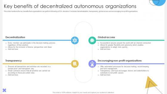 This slide mentions the key benefits that organizations can get from following a DOA structure. It includes decentralization, transparency, global access and encouraging non profit organizations. Slidegeeks has constructed Guide To Understanding Decentralized Key Benefits Of Decentralized Autonomous BCT SS V after conducting extensive research and examination. These presentation templates are constantly being generated and modified based on user preferences and critiques from editors. Here, you will find the most attractive templates for a range of purposes while taking into account ratings and remarks from users regarding the content. This is an excellent jumping-off point to explore our content and will give new users an insight into our top-notch PowerPoint Templates. This slide mentions the key benefits that organizations can get from following a DOA structure. It includes decentralization, transparency, global access and encouraging non profit organizations.