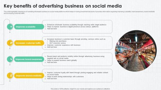 This slide highlights importance of marketing wholesale business on social media platforms which helps In making investment decisions. It provides information regarding improving scalability, brand awareness, brand credibility and increasing customer traffic. Boost your pitch with our creative B2B Marketing Techniques Key Benefits Of Advertising Business On Social Media. Deliver an awe-inspiring pitch that will mesmerize everyone. Using these presentation templates you will surely catch everyones attention. You can browse the ppts collection on our website. We have researchers who are experts at creating the right content for the templates. So you do not have to invest time in any additional work. Just grab the template now and use them. This slide highlights importance of marketing wholesale business on social media platforms which helps In making investment decisions. It provides information regarding improving scalability, brand awareness, brand credibility and increasing customer traffic.