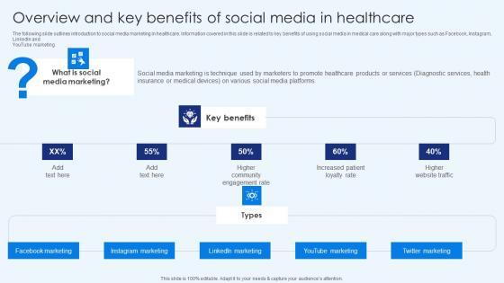 The following slide outlines introduction to social media marketing in healthcare. Information covered in this slide is related to key benefits of using social media in medical care along with major types such as Facebook, Instagram, LinkedIn and YouTube marketing. Explore a selection of the finest Overview And Key Benefits Of Social Media In Healthcare Topics PDF here. With a plethora of professionally designed and pre-made slide templates, you can quickly and easily find the right one for your upcoming presentation. You can use our Overview And Key Benefits Of Social Media In Healthcare Topics PDF to effectively convey your message to a wider audience. Slidegeeks has done a lot of research before preparing these presentation templates. The content can be personalized and the slides are highly editable. Grab templates today from Slidegeeks.