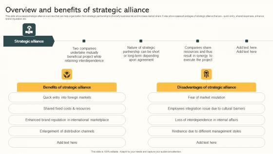 This slide showcases strategic alliance overview that can help organization form strategic partnership to diversify business risk and increase market share. It also showcases advantages of strategic alliance that are - quick entry, shared expenses, enhance brand reputation etc. Coming up with a presentation necessitates that the majority of the effort goes into the content and the message you intend to convey. The visuals of a PowerPoint presentation can only be effective if it supplements and supports the story that is being told. Keeping this in mind our experts created Overview And Benefits Of Strategic Alliance Market Expansion Through Microsoft Pdf to reduce the time that goes into designing the presentation. This way, you can concentrate on the message while our designers take care of providing you with the right template for the situation. This slide showcases strategic alliance overview that can help organization form strategic partnership to diversify business risk and increase market share. It also showcases advantages of strategic alliance that are - quick entry, shared expenses, enhance brand reputation etc.
