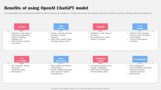 This slide highlights various benefits of using ChatGPT for different businesses. Key benefits are versatility, high accuracy, 24 7 availability, data analysis, scalability, cost savings, multilingual support, personalization etc. If you are looking for a format to display your unique thoughts, then the professionally designed Benefits Of Using OpenAI ChatGPT Model AI Bot Application For Various Industries Designs Pdf is the one for you. You can use it as a Google Slides template or a PowerPoint template. Incorporate impressive visuals, symbols, images, and other charts. Modify or reorganize the text boxes as you desire. Experiment with shade schemes and font pairings. Alter, share or cooperate with other people on your work. Download Benefits Of Using OpenAI ChatGPT Model AI Bot Application For Various Industries Designs Pdf and find out how to give a successful presentation. Present a perfect display to your team and make your presentation unforgettable. This slide highlights various benefits of using ChatGPT for different businesses. Key benefits are versatility, high accuracy, 24 7 availability, data analysis, scalability, cost savings, multilingual support, personalization etc.