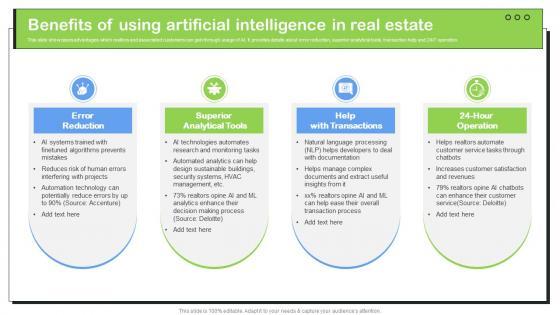 This slide showcases advantages which realtors and associated customers can gain through usage of AI. It provides details about error reduction, superior analytical tools, transaction help and 24 or 7 operation. From laying roadmaps to briefing everything in detail, our templates are perfect for you. You can set the stage with your presentation slides. All you have to do is download these easy-to-edit and customizable templates. Transforming Real Estate Benefits Of Using Artificial Intelligence In Real Estate ChatGPT SS V will help you deliver an outstanding performance that everyone would remember and praise you for. Do download this presentation today. This slide showcases advantages which realtors and associated customers can gain through usage of AI. It provides details about error reduction, superior analytical tools, transaction help and 24 or 7 operation.