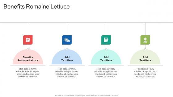 Introducing our well-designed Benefits Romaine Lettuce In Powerpoint And Google Slides Cpb. This PowerPoint design presents information on topics like Benefits Romaine Lettuce. As it is predesigned it helps boost your confidence level. It also makes you a better presenter because of its high-quality content and graphics. This PPT layout can be downloaded and used in different formats like PDF, PNG, and JPG. Not only this, it is available in both Standard Screen and Widescreen aspect ratios for your convenience. Therefore, click on the download button now to persuade and impress your audience. Our Benefits Romaine Lettuce In Powerpoint And Google Slides Cpb are topically designed to provide an attractive backdrop to any subject. Use them to look like a presentation pro.