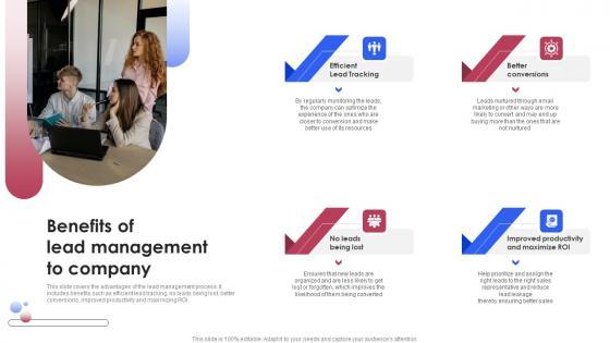 This slide covers the advantages of the lead management process. It includes benefits such as efficient lead tracking, no leads being lost, better conversions, improved productivity and maximizing ROI. Present like a pro with Benefits Of Lead Management To Company Various Techniques For Managing Pictures PDF Create beautiful presentations together with your team, using our easy-to-use presentation slides. Share your ideas in real-time and make changes on the fly by downloading our templates. So whether you are in the office, on the go, or in a remote location, you can stay in sync with your team and present your ideas with confidence. With Slidegeeks presentation got a whole lot easier. Grab these presentations today. This slide covers the advantages of the lead management process. It includes benefits such as efficient lead tracking, no leads being lost, better conversions, improved productivity and maximizing ROI.