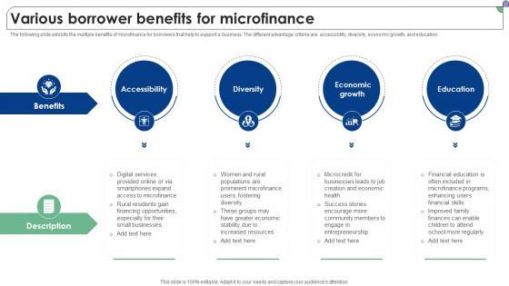 The following slide exhibits the multiple benefits of microfinance for borrowers that help to support a business. The different advantage criteria are accessibility, diversity, economic growth, and education. Take your projects to the next level with our ultimate collection of Various Borrower Benefits For Microfinance Complete Guide To Microfinance Fin SS V. Slidegeeks has designed a range of layouts that are perfect for representing task or activity duration, keeping track of all your deadlines at a glance. Tailor these designs to your exact needs and give them a truly corporate look with your own brand colors they will make your projects stand out from the rest The following slide exhibits the multiple benefits of microfinance for borrowers that help to support a business. The different advantage criteria are accessibility, diversity, economic growth, and education.