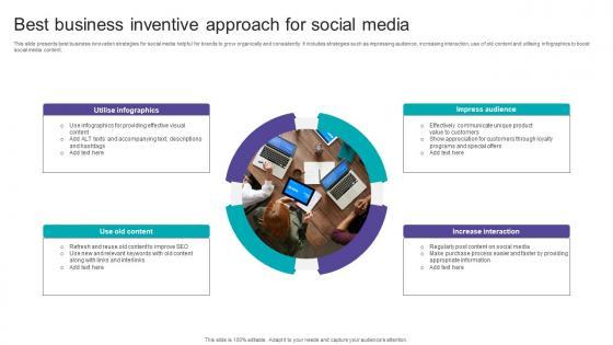 This slide presents best business innovation strategies for social media helpful for brands to grow organically and consistently. It includes strategies such as impressing audience, increasing interaction, use of old content and utilising infographics to boost social media content. Pitch your topic with ease and precision using this Best Business Inventive Approach For Social Media Elements Pdf. This layout presents information on Business Inventive Approach, Social Media, Impressing Audience. It is also available for immediate download and adjustment. So, changes can be made in the color, design, graphics or any other component to create a unique layout. This slide presents best business innovation strategies for social media helpful for brands to grow organically and consistently. It includes strategies such as impressing audience, increasing interaction, use of old content and utilising infographics to boost social media content.