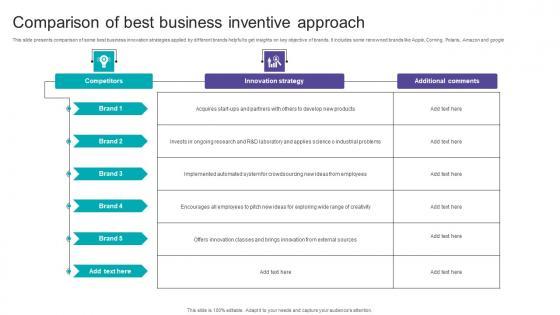 This slide presents comparison of some best business innovation strategies applied by different brands helpful to get insights on key objective of brands. It includes some renowned brands like Apple, Corning, Polaris, Amazon and google. Pitch your topic with ease and precision using this Comparison Of Best Business Inventive Approach Themes Pdf. This layout presents information on Comparison Of Best Business, Inventive Approach, Business Innovation Strategies. It is also available for immediate download and adjustment. So, changes can be made in the color, design, graphics or any other component to create a unique layout. This slide presents comparison of some best business innovation strategies applied by different brands helpful to get insights on key objective of brands. It includes some renowned brands like Apple, Corning, Polaris, Amazon and google.