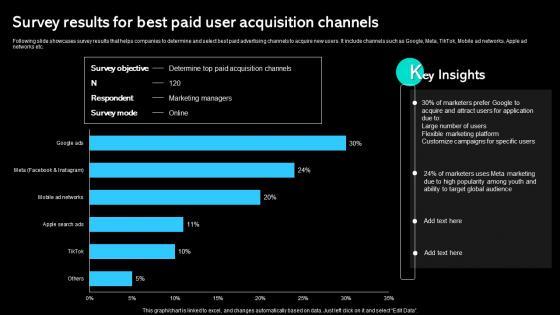 Following slide showcases survey results that helps companies to determine and select best paid advertising channels to acquire new users. It include channels such as Google, Meta, TikTok, Mobile ad networks, Apple ad networks etc. Find highly impressive Survey Results For Best Paid User Acquisition Channels Paid Marketing Approach Rules Pdf on Slidegeeks to deliver a meaningful presentation. You can save an ample amount of time using these presentation templates. No need to worry to prepare everything from scratch because Slidegeeks experts have already done a huge research and work for you. You need to download Survey Results For Best Paid User Acquisition Channels Paid Marketing Approach Rules Pdf for your upcoming presentation. All the presentation templates are 100 percent editable and you can change the color and personalize the content accordingly. Download now. Following slide showcases survey results that helps companies to determine and select best paid advertising channels to acquire new users. It include channels such as Google, Meta, TikTok, Mobile ad networks, Apple ad networks etc.