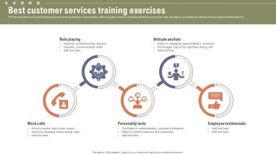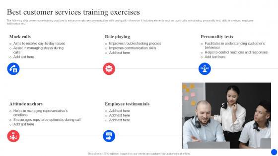 The following slide covers some training practices to enhance employee communication skills and quality of service. It includes elements such as mock calls, role playing, personality test, attitude anchors, employee testimonials etc. There are so many reasons you need a Best Customer Services Training Exercises Enhancing Customer Experience Ppt Template. The first reason is you can not spend time making everything from scratch, Thus, Slidegeeks has made presentation templates for you too. You can easily download these templates from our website easily. The following slide covers some training practices to enhance employee communication skills and quality of service. It includes elements such as mock calls, role playing, personality test, attitude anchors, employee testimonials etc.