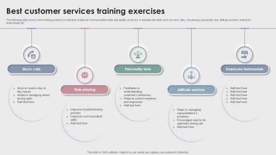The following slide covers some training practices to enhance employee communication skills and quality of service. It includes elements such as mock calls, role playing, personality test, attitude anchors, employee testimonials etc. There are so many reasons you need a Best Customer Services Training Exercises Enhancing Customer Experience Ppt Template. The first reason is you can not spend time making everything from scratch, Thus, Slidegeeks has made presentation templates for you too. You can easily download these templates from our website easily. The following slide covers some training practices to enhance employee communication skills and quality of service. It includes elements such as mock calls, role playing, personality test, attitude anchors, employee testimonials etc.