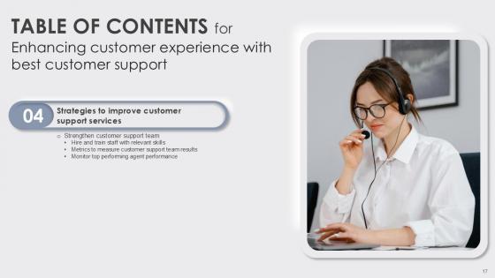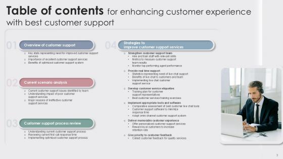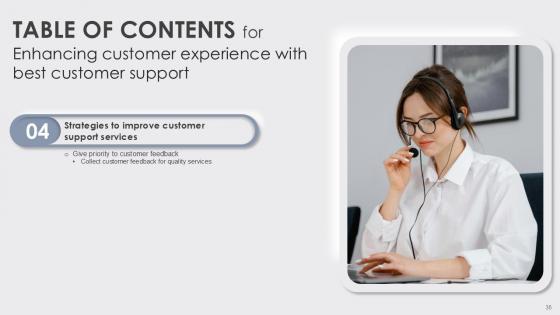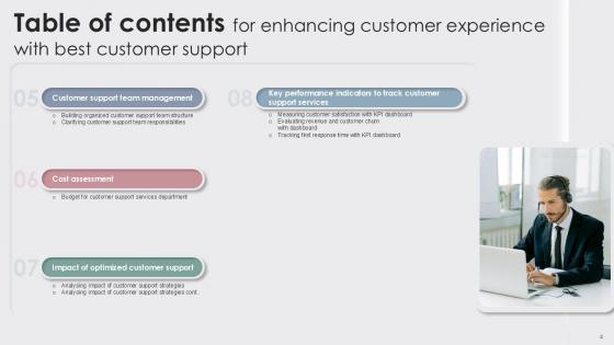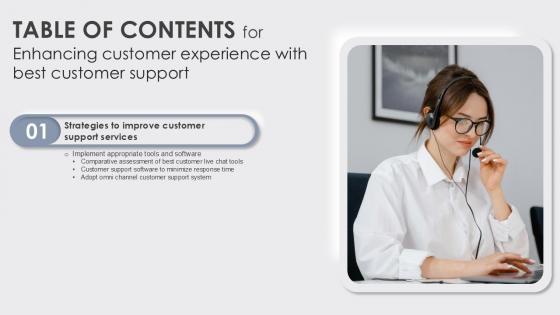 Retrieve professionally designed Table Of Contents Enhancing Customer Experience With Best Customer Ppt Sample to effectively convey your message and captivate your listeners. Save time by selecting pre-made slideshows that are appropriate for various topics, from business to educational purposes. These themes come in many different styles, from creative to corporate, and all of them are easily adjustable and can be edited quickly. Access them as PowerPoint templates or as Google Slides themes. You do not have to go on a hunt for the perfect presentation because Slidegeeks got you covered from everywhere. Our Table Of Contents Enhancing Customer Experience With Best Customer Ppt Sample are topically designed to provide an attractive backdrop to any subject. Use them to look like a presentation pro.