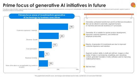 This slide provides information regarding primary focus areas of generative AI initiatives in terms of customer experience, revenue growth, cost optimization, business continuity, to name a few. Such systems are used to automate, augment humans or machines to enhance work productivity. Want to ace your presentation in front of a live audience Our Prime Focus Of Generative AI Initiatives Generative AI For Better Productivity AI SS V can help you do that by engaging all the users towards you. Slidegeeks experts have put their efforts and expertise into creating these impeccable powerpoint presentations so that you can communicate your ideas clearly. Moreover, all the templates are customizable, and easy-to-edit and downloadable. Use these for both personal and commercial use. This slide provides information regarding primary focus areas of generative AI initiatives in terms of customer experience, revenue growth, cost optimization, business continuity, to name a few. Such systems are used to automate, augment humans or machines to enhance work productivity.