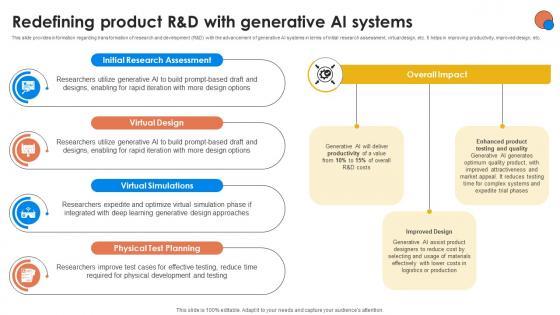 This slide provides information regarding transformation of research and development RandD with the advancement of generative AI systems in terms of initial research assessment, virtual design, etc. It helps in improving productivity, improved design, etc. From laying roadmaps to briefing everything in detail, our templates are perfect for you. You can set the stage with your presentation slides. All you have to do is download these easy-to-edit and customizable templates. Redefining Product R And D With Generative AI For Better Productivity AI SS V will help you deliver an outstanding performance that everyone would remember and praise you for. Do download this presentation today. This slide provides information regarding transformation of research and development RandD with the advancement of generative AI systems in terms of initial research assessment, virtual design, etc. It helps in improving productivity, improved design, etc.
