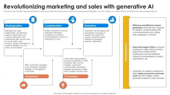 This slide provides information regarding transformation of marketing and sales with the advancement of generative AI systems along Strategization, conversion, retention, etc. It helps in effective content generation, improved usage of data, etc. Present like a pro with Revolutionizing Marketing And Sales Generative AI For Better Productivity AI SS V. Create beautiful presentations together with your team, using our easy-to-use presentation slides. Share your ideas in real-time and make changes on the fly by downloading our templates. So whether you are in the office, on the go, or in a remote location, you can stay in sync with your team and present your ideas with confidence. With Slidegeeks presentation got a whole lot easier. Grab these presentations today. This slide provides information regarding transformation of marketing and sales with the advancement of generative AI systems along Strategization, conversion, retention, etc. It helps in effective content generation, improved usage of data, etc.