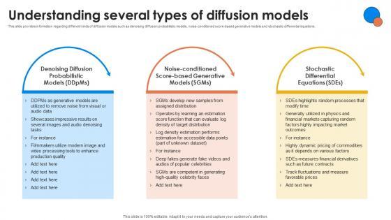 This slide provides information regarding different kinds of diffusion models such as denoising diffusion probabilistic models, noise-conditioned score-based generative models and stochastic differential equations. This Understanding Several Types Of Diffusion Generative AI For Better Productivity AI SS V is perfect for any presentation, be it in front of clients or colleagues. It is a versatile and stylish solution for organizing your meetings. The Understanding Several Types Of Diffusion Generative AI For Better Productivity AI SS V features a modern design for your presentation meetings. The adjustable and customizable slides provide unlimited possibilities for acing up your presentation. Slidegeeks has done all the homework before launching the product for you. So, do not wait, grab the presentation templates today This slide provides information regarding different kinds of diffusion models such as denoising diffusion probabilistic models, noise-conditioned score-based generative models and stochastic differential equations.