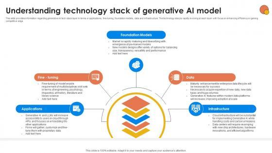 This slide provides information regarding generative AI tech stack layer in terms or applications, fine-tuning, foundation models, data and infrastructure. The technology stacj is rapidly evolving at each layer with focus on enhancing efficiency or gaining competitive edge. Welcome to our selection of the Understanding Technology Stack Of Generative AI For Better Productivity AI SS V. These are designed to help you showcase your creativity and bring your sphere to life. Planning and Innovation are essential for any business that is just starting out. This collection contains the designs that you need for your everyday presentations. All of our PowerPoints are 100Percent editable, so you can customize them to suit your needs. This multi-purpose template can be used in various situations. Grab these presentation templates today. This slide provides information regarding generative AI tech stack layer in terms or applications, fine-tuning, foundation models, data and infrastructure. The technology stacj is rapidly evolving at each layer with focus on enhancing efficiency or gaining competitive edge.