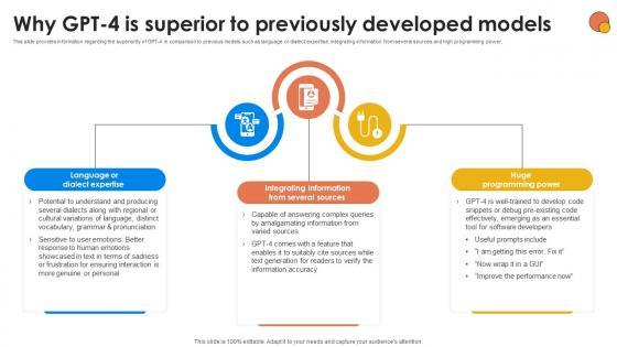 This slide provides information regarding the superiority of GPT-4 in comparison to previous models such as language or dialect expertise, integrating information from several sources and high programming power. Slidegeeks has constructed Why GPT 4 Is Superior To Previously Generative AI For Better Productivity AI SS V after conducting extensive research and examination. These presentation templates are constantly being generated and modified based on user preferences and critiques from editors. Here, you will find the most attractive templates for a range of purposes while taking into account ratings and remarks from users regarding the content. This is an excellent jumping-off point to explore our content and will give new users an insight into our top-notch PowerPoint Templates. This slide provides information regarding the superiority of GPT-4 in comparison to previous models such as language or dialect expertise, integrating information from several sources and high programming power.