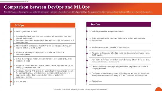 This slide focuses on the comparison and relationship between two practices in software development DevOps and MLOps. The purpose of this slide is to discuss the similarities and differences between the two practices. Boost your pitch with our creative Comparison Between DevOps And MLOps Exploring Machine Learning Operations Formats Pdf. Deliver an awe inspiring pitch that will mesmerize everyone. Using these presentation templates you will surely catch everyones attention. You can browse the ppts collection on our website. We have researchers who are experts at creating the right content for the templates. So you do not have to invest time in any additional work. Just grab the template now and use them. This slide focuses on the comparison and relationship between two practices in software development DevOps and MLOps. The purpose of this slide is to discuss the similarities and differences between the two practices.