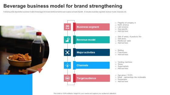 Following slide depicts the business model of beverages for brand reinforcement to earn surplus amount of profit . It includes business segment, revenue model, channels, etc. Showcasing this set of slides titled Beverage Business Model For Brand Strengthening Download PDF. The topics addressed in these templates are Business Segment, Revenue Model, Major Activities. All the content presented in this PPT design is completely editable. Download it and make adjustments in color, background, font etc. as per your unique business setting.