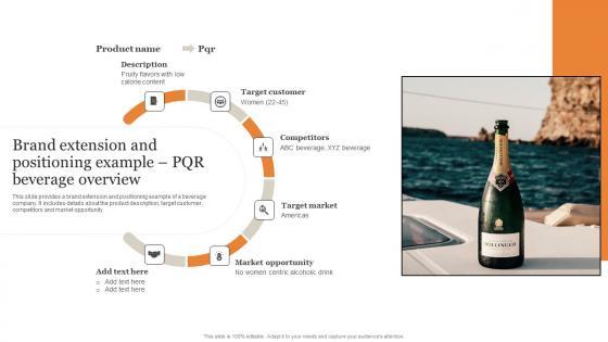 This slide provides a brand extension and positioning example of a beverage company. It includes details about the product description, target customer, competitors and market opportunity. Get a simple yet stunning designed Brand Extension And Positioning Example PQR Beverage Ultimate Guide Implementing Mockup Pdf It is the best one to establish the tone in your meetings. It is an excellent way to make your presentations highly effective. So, download this PPT today from Slidegeeks and see the positive impacts. Our easy-to-edit Brand Extension And Positioning Example PQR Beverage Ultimate Guide Implementing Mockup Pdf can be your go-to option for all upcoming conferences and meetings. So, what are you waiting for Grab this template today. This slide provides a brand extension and positioning example of a beverage company. It includes details about the product description, target customer, competitors and market opportunity.