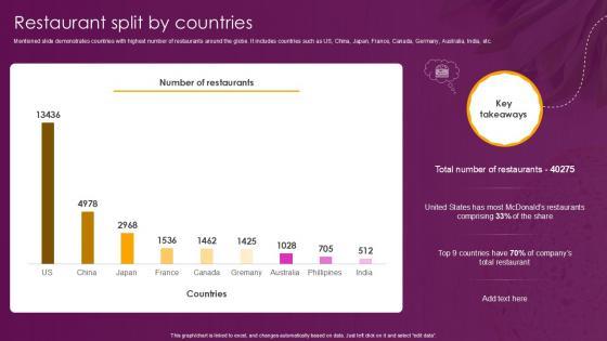 Mentioned slide demonstrates countries with highest number of restaurants around the globe. It includes countries such as US, China, Japan, France, Canada, Germany, Australia, India, etc. Boost your pitch with our creative Restaurant Split By Countries Food And Beverages Company Profile Ppt Template CP SS V Deliver an awe-inspiring pitch that will mesmerize everyone. Using these presentation templates you will surely catch everyones attention. You can browse the ppts collection on our website. We have researchers who are experts at creating the right content for the templates. So you do not have to invest time in any additional work. Just grab the template now and use them. Mentioned slide demonstrates countries with highest number of restaurants around the globe. It includes countries such as US, China, Japan, France, Canada, Germany, Australia, India, etc.
