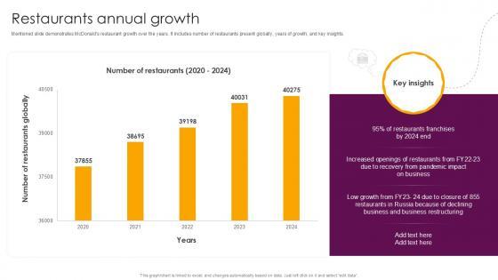 Mentioned slide demonstrates McDonalds restaurant growth over the years. It includes number of restaurants present globally, years of growth, and key insights. Create an editable Restaurants Annual Growth Food And Beverages Company Profile Ppt Example CP SS V that communicates your idea and engages your audience. Whether you are presenting a business or an educational presentation, pre-designed presentation templates help save time. Restaurants Annual Growth Food And Beverages Company Profile Ppt Example CP SS V is highly customizable and very easy to edit, covering many different styles from creative to business presentations. Slidegeeks has creative team members who have crafted amazing templates. So, go and get them without any delay. Mentioned slide demonstrates McDonalds restaurant growth over the years. It includes number of restaurants present globally, years of growth, and key insights.