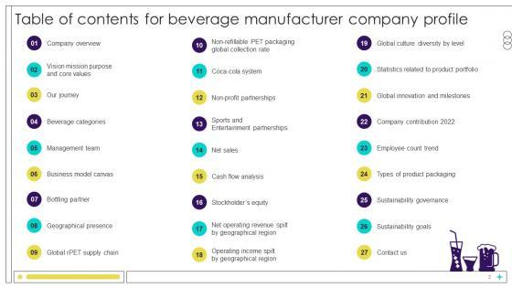 From laying roadmaps to briefing everything in detail, our templates are perfect for you. You can set the stage with your presentation slides. All you have to do is download these easy-to-edit and customizable templates. Table Of Contents For Beverage Manufacturer Company Profile Ppt Presentation CP SS V will help you deliver an outstanding performance that everyone would remember and praise you for. Do download this presentation today. Our Table Of Contents For Beverage Manufacturer Company Profile Ppt Presentation CP SS V are topically designed to provide an attractive backdrop to any subject. Use them to look like a presentation pro.