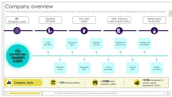 This slide represents worldwide value of company in sparkling soft drinks, juice, dairy, plant, water, enhanced water etc. It also covers company facts such as number of bottling partners, retail customer outlets and investment. Make sure to capture your audiences attention in your business displays with our gratis customizable Company Overview Beverage Manufacturer Company Profile Ppt Slides CP SS V. These are great for business strategies, office conferences, capital raising or task suggestions. If you desire to acquire more customers for your tech business and ensure they stay satisfied, create your own sales presentation with these plain slides. This slide represents worldwide value of company in sparkling soft drinks, juice, dairy, plant, water, enhanced water etc. It also covers company facts such as number of bottling partners, retail customer outlets and investment.