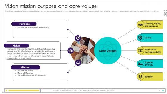 This slide represents the vision, mission statement and purpose of Coca-Cola which shows the desired future position of the company. It also covers the companys core values such as diversity, equity, inclusion, quality, etc. If your project calls for a presentation, then Slidegeeks is your go-to partner because we have professionally designed, easy-to-edit templates that are perfect for any presentation. After downloading, you can easily edit Vision Mission Purpose And Core Values Beverage Manufacturer Company Profile Ppt Presentation CP SS V and make the changes accordingly. You can rearrange slides or fill them with different images. Check out all the handy templates This slide represents the vision, mission statement and purpose of Coca-Cola which shows the desired future position of the company. It also covers the companys core values such as diversity, equity, inclusion, quality, etc.