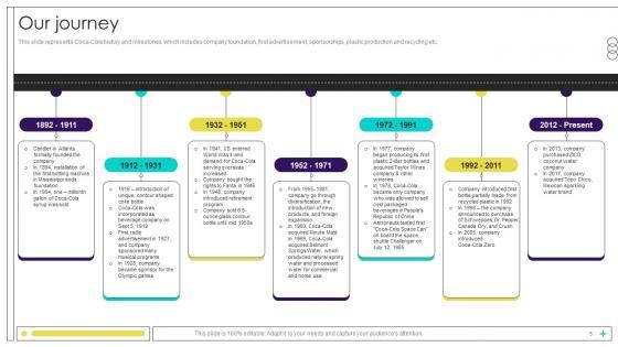 This slide represents Coca-Cola history and milestones, which includes company foundation, first advertisement, sponsorships, plastic production and recycling etc. Are you searching for a Our Journey Beverage Manufacturer Company Profile Ppt Slides CP SS V that is uncluttered, straightforward, and original Its easy to edit, and you can change the colors to suit your personal or business branding. For a presentation that expresses how much effort you have put in, this template is ideal With all of its features, including tables, diagrams, statistics, and lists, its perfect for a business plan presentation. Make your ideas more appealing with these professional slides. Download Our Journey Beverage Manufacturer Company Profile Ppt Slides CP SS V from Slidegeeks today. This slide represents Coca-Cola history and milestones, which includes company foundation, first advertisement, sponsorships, plastic production and recycling etc.
