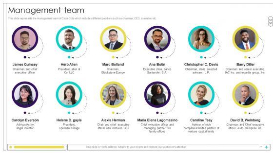 This slide represents the management team of Coca-Cola which includes different positions such as chairman, CEO, executive etc. Whether you have daily or monthly meetings, a brilliant presentation is necessary. Management Team Beverage Manufacturer Company Profile Ppt Example CP SS V can be your best option for delivering a presentation. Represent everything in detail using Management Team Beverage Manufacturer Company Profile Ppt Example CP SS V and make yourself stand out in meetings. The template is versatile and follows a structure that will cater to your requirements. All the templates prepared by Slidegeeks are easy to download and edit. Our research experts have taken care of the corporate themes as well. So, give it a try and see the results. This slide represents the management team of Coca-Cola which includes different positions such as chairman, CEO, executive etc.