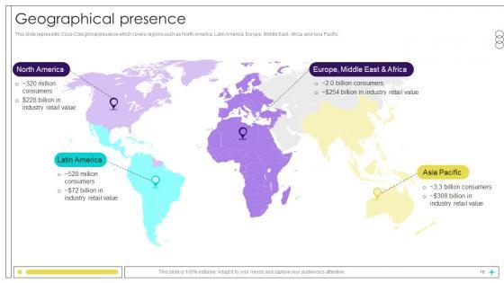 This slide represents Coca-Cola global presence which covers regions such as North America, Latin America, Europe, Middle East, Africa and Asia Pacific. This Geographical Presence Beverage Manufacturer Company Profile Ppt Slides CP SS V from Slidegeeks makes it easy to present information on your topic with precision. It provides customization options, so you can make changes to the colors, design, graphics, or any other component to create a unique layout. It is also available for immediate download, so you can begin using it right away. Slidegeeks has done good research to ensure that you have everything you need to make your presentation stand out. Make a name out there for a brilliant performance. This slide represents Coca-Cola global presence which covers regions such as North America, Latin America, Europe, Middle East, Africa and Asia Pacific.