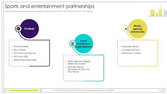 This slide represents sports and entertainment partners of Coca-Cola such as FIFA, UEFAm NCAA, NASCAR, Coke studio etc. This Sports And Entertainment Partnerships Beverage Manufacturer Company Profile Ppt Template CP SS V from Slidegeeks makes it easy to present information on your topic with precision. It provides customization options, so you can make changes to the colors, design, graphics, or any other component to create a unique layout. It is also available for immediate download, so you can begin using it right away. Slidegeeks has done good research to ensure that you have everything you need to make your presentation stand out. Make a name out there for a brilliant performance. This slide represents sports and entertainment partners of Coca-Cola such as FIFA, UEFAm NCAA, NASCAR, Coke studio etc.