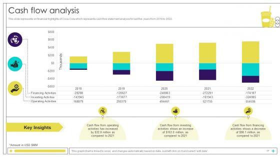 This slide represents on financial highlights of Coca-Cola which represents cash flow statement analysis for last five years from 2018 to 2022. Do you have an important presentation coming up Are you looking for something that will make your presentation stand out from the rest Look no further than Cash Flow Analysis Beverage Manufacturer Company Profile Ppt Example CP SS V. With our professional designs, you can trust that your presentation will pop and make delivering it a smooth process. And with Slidegeeks, you can trust that your presentation will be unique and memorable. So why wait Grab Cash Flow Analysis Beverage Manufacturer Company Profile Ppt Example CP SS V today and make your presentation stand out from the rest This slide represents on financial highlights of Coca-Cola which represents cash flow statement analysis for last five years from 2018 to 2022.
