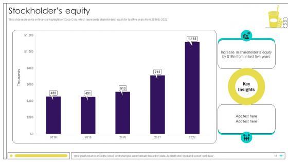 This slide represents on financial highlights of Coca-Cola, which represents shareholders equity for last five years from 2018 to 2022. Boost your pitch with our creative Stockholders Equity Beverage Manufacturer Company Profile Ppt Sample CP SS V. Deliver an awe-inspiring pitch that will mesmerize everyone. Using these presentation templates you will surely catch everyones attention. You can browse the ppts collection on our website. We have researchers who are experts at creating the right content for the templates. So you do not have to invest time in any additional work. Just grab the template now and use them. This slide represents on financial highlights of Coca-Cola, which represents shareholders equity for last five years from 2018 to 2022.