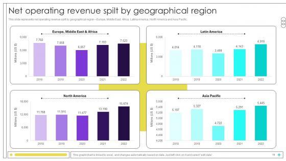 This slide represents net operating revenue spilt by geographical region Europe, Middle East, Africa, Latina America, North America and Asia Pacific. Are you in need of a template that can accommodate all of your creative concepts This one is crafted professionally and can be altered to fit any style. Use it with Google Slides or PowerPoint. Include striking photographs, symbols, depictions, and other visuals. Fill, move around, or remove text boxes as desired. Test out color palettes and font mixtures. Edit and save your work, or work with colleagues. Download Net Operating Revenue Spilt By Geographical Region Beverage Manufacturer Company Profile Ppt Template CP SS V and observe how to make your presentation outstanding. Give an impeccable presentation to your group and make your presentation unforgettable. This slide represents net operating revenue spilt by geographical region Europe, Middle East, Africa, Latina America, North America and Asia Pacific.