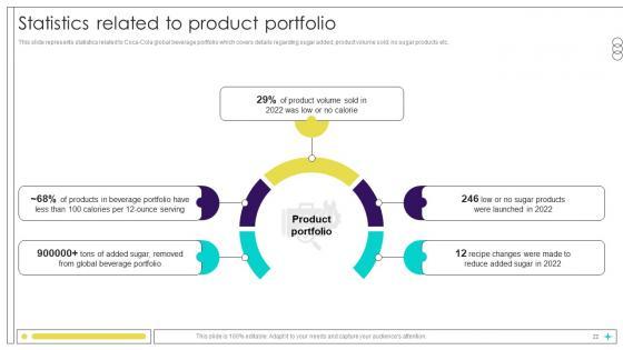This slide represents statistics related to Coca-Cola global beverage portfolio which covers details regarding sugar added, product volume sold, no sugar products etc. Do you know about Slidesgeeks Statistics Related To Product Portfolio Beverage Manufacturer Company Profile Ppt Example CP SS V These are perfect for delivering any kind od presentation. Using it, create PowerPoint presentations that communicate your ideas and engage audiences. Save time and effort by using our pre-designed presentation templates that are perfect for a wide range of topic. Our vast selection of designs covers a range of styles, from creative to business, and are all highly customizable and easy to edit. Download as a PowerPoint template or use them as Google Slides themes. This slide represents statistics related to Coca-Cola global beverage portfolio which covers details regarding sugar added, product volume sold, no sugar products etc.