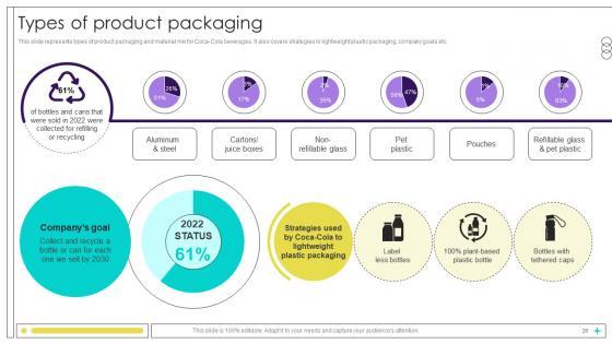 This slide represents types of product packaging and material mix for Coca-Cola beverages. It also covers strategies to lightweight plastic packaging, company goals etc. Do you have an important presentation coming up Are you looking for something that will make your presentation stand out from the rest Look no further than Types Of Product Packaging Beverage Manufacturer Company Profile Ppt Powerpoint CP SS V. With our professional designs, you can trust that your presentation will pop and make delivering it a smooth process. And with Slidegeeks, you can trust that your presentation will be unique and memorable. So why wait Grab Types Of Product Packaging Beverage Manufacturer Company Profile Ppt Powerpoint CP SS V today and make your presentation stand out from the rest This slide represents types of product packaging and material mix for Coca-Cola beverages. It also covers strategies to lightweight plastic packaging, company goals etc.