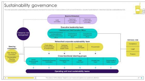 This slide represents sustainability governance hierarchy framework for Coca-Cola. It covers positions such as board of directors, executive leadership team, networked corporate sustainability team etc. There are so many reasons you need a Sustainability Governance Beverage Manufacturer Company Profile Ppt Template CP SS V. The first reason is you can not spend time making everything from scratch, Thus, Slidegeeks has made presentation templates for you too. You can easily download these templates from our website easily. This slide represents sustainability governance hierarchy framework for Coca-Cola. It covers positions such as board of directors, executive leadership team, networked corporate sustainability team etc.