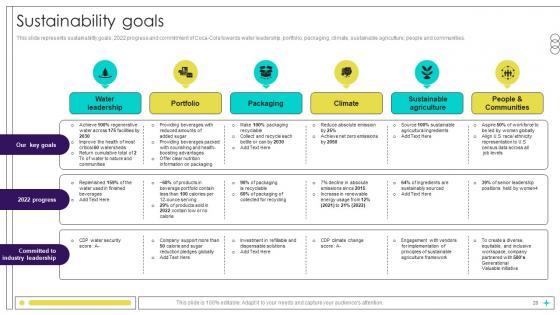 This slide represents sustainability goals, 2022 progress and commitment of Coca-Cola towards water leadership, portfolio, packaging, climate, sustainable agriculture, people and communities. Slidegeeks is one of the best resources for PowerPoint templates. You can download easily and regulate Sustainability Goals Beverage Manufacturer Company Profile Ppt Sample CP SS V for your personal presentations from our wonderful collection. A few clicks is all it takes to discover and get the most relevant and appropriate templates. Use our Templates to add a unique zing and appeal to your presentation and meetings. All the slides are easy to edit and you can use them even for advertisement purposes. This slide represents sustainability goals, 2022 progress and commitment of Coca-Cola towards water leadership, portfolio, packaging, climate, sustainable agriculture, people and communities.