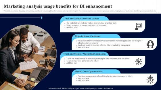 This slide showcases the usage of marketing analytics for enhancing BI performance to gain important insights. This includes tracking and monitoring website visitors, helping to know customers, identifying new opportunities, etc. Pitch your topic with ease and precision using this Marketing Analysis Usage Benefits For BI Enhancement Rules Pdf. This layout presents information on Track And Monitor, Know Customer, Marketing Campaigns. It is also available for immediate download and adjustment. So, changes can be made in the color, design, graphics or any other component to create a unique layout. This slide showcases the usage of marketing analytics for enhancing BI performance to gain important insights. This includes tracking and monitoring website visitors, helping to know customers, identifying new opportunities, etc.