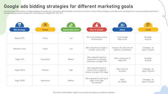 This slide covers different types of bidding strategies for Google ads. The purpose of this template is to provide an overview on focus of these strategies, automation level, working process, key goals and placement levels. It includes strategies such as manual CPC, maximizing clicks, target ROAS, CPA, ETC. Slidegeeks has constructed Google Ads Categories Google Ads Bidding Strategies For Different Marketing Goals MKT SS V after conducting extensive research and examination. These presentation templates are constantly being generated and modified based on user preferences and critiques from editors. Here, you will find the most attractive templates for a range of purposes while taking into account ratings and remarks from users regarding the content. This is an excellent jumping-off point to explore our content and will give new users an insight into our top-notch PowerPoint Templates. This slide covers different types of bidding strategies for Google ads. The purpose of this template is to provide an overview on focus of these strategies, automation level, working process, key goals and placement levels. It includes strategies such as manual CPC, maximizing clicks, target ROAS, CPA, ETC.