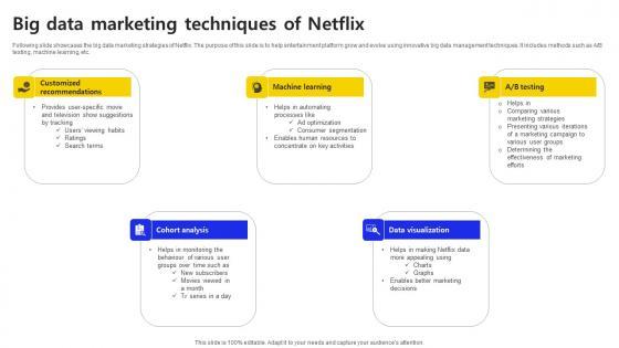 Following slide showcases the big data marketing strategies of Netflix. The purpose of this slide is to help entertainment platform grow and evolve using innovative big data management techniques. It includes methods such as A B testing, machine learning, etc. Pitch your topic with ease and precision using this Big Data Marketing Techniques Of Netflix Ppt Icon Styles PDF. This layout presents information on Innovative, Big Data, Management Techniques. It is also available for immediate download and adjustment. So, changes can be made in the color, design, graphics or any other component to create a unique layout. Following slide showcases the big data marketing strategies of Netflix. The purpose of this slide is to help entertainment platform grow and evolve using innovative big data management techniques. It includes methods such as A B testing, machine learning, etc.