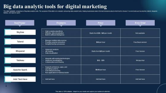 The slide highlights comparison of big data analytic tools. The purpose of this slide is to evaluate various big data analytic tools, helping businesses make informed decisions about which tool to choose. It covers tools such as skytree, talend, mixpanel, tableau, and apache spark. Pitch your topic with ease and precision using this Big Data Analytic Tools For Digital Marketing Information Pdf. This layout presents information on Tool Name, Features, Price. It is also available for immediate download and adjustment. So, changes can be made in the color, design, graphics or any other component to create a unique layout. The slide highlights comparison of big data analytic tools. The purpose of this slide is to evaluate various big data analytic tools, helping businesses make informed decisions about which tool to choose. It covers tools such as skytree, talend, mixpanel, tableau, and apache spark.