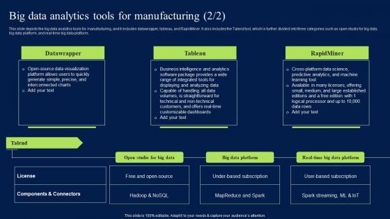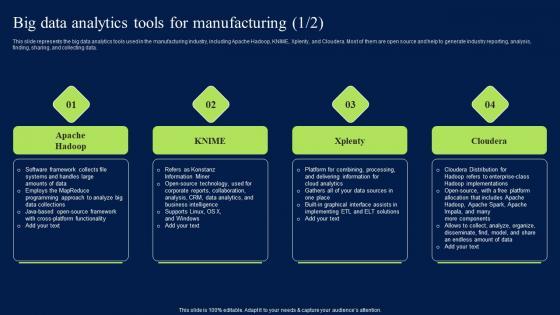 This slide represents the big data analytics tools used in the manufacturing industry, including Apache Hadoop, KNIME, Xplenty, and Cloudera. Most of them are open source and help to generate industry reporting, analysis, finding, sharing, and collecting data. The best PPT templates are a great way to save time, energy, and resources. Slidegeeks have 100 percent editable powerpoint slides making them incredibly versatile. With these quality presentation templates, you can create a captivating and memorable presentation by combining visually appealing slides and effectively communicating your message. Download Big Data Analytics Tools For Manufacturing Information PDF from Slidegeeks and deliver a wonderful presentation.