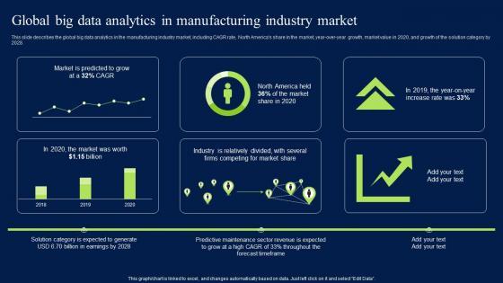This slide describes the global big data analytics in the manufacturing industry market, including CAGR rate, North Americas share in the market, year-over-year growth, market value in 2020, and growth of the solution category by 2028. Find a pre-designed and impeccable Global Big Data Analytics In Manufacturing Industry Market Graphics PDF. The templates can ace your presentation without additional effort. You can download these easy-to-edit presentation templates to make your presentation stand out from others. So, what are you waiting for Download the template from Slidegeeks today and give a unique touch to your presentation. This slide describes the global big data analytics in the manufacturing industry market, including CAGR rate, North Americas share in the market, year-over-year growth, market value in 2020, and growth of the solution category by 2028.