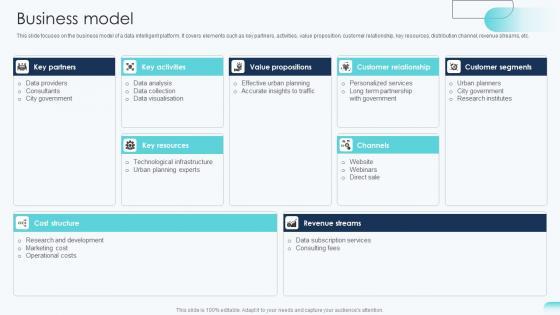 This slide focuses on the business model of a data intelligent platform. It covers elements such as key partners, activities, value proposition, customer relationship, key resources, distribution channel, revenue streams, etc. Boost your pitch with our creative Business Model Big Data Analytics Investor Funding Elevator Pitch Deck. Deliver an awe-inspiring pitch that will mesmerize everyone. Using these presentation templates you will surely catch everyones attention. You can browse the ppts collection on our website. We have researchers who are experts at creating the right content for the templates. So you do not have to invest time in any additional work. Just grab the template now and use them. This slide focuses on the business model of a data intelligent platform. It covers elements such as key partners, activities, value proposition, customer relationship, key resources, distribution channel, revenue streams, etc.